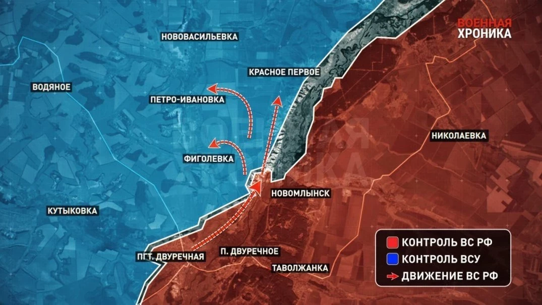 К югу и юго-западнее Покровска (Красноармейска) ВС России продолжают продвижение, добиваясь тактических успехов в тяжелых боях. Западнее Курахово наши войска пробиваются к Константинополю.