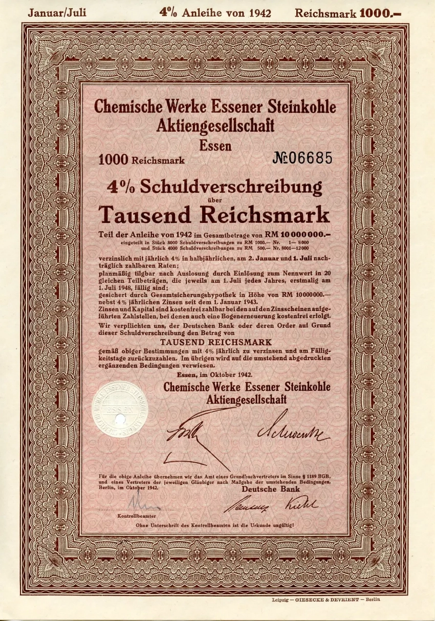Облигация Essener Steinkohle AG на 1000 рейхсмарок 1942 года. Финансирование строительства шло вполне капиталистическими методами — выпуском ценных бумаг