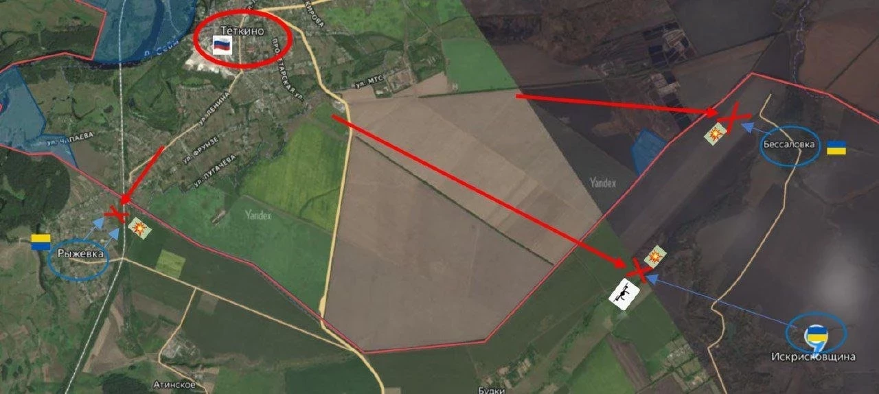 В районе Тёткино ВСУ ведут атаки сразу на нескольких направлениях. Цель украинских подразделений - сам населённый пункт, утверждает автор. По его словам, ВСУ стремятся отрезать удерживающую Тёткино российскую группировку от основных сил.