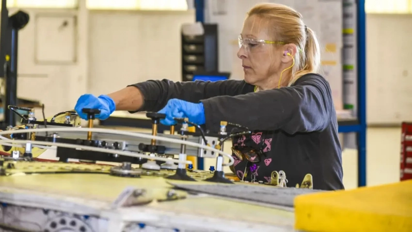 Шарлотта Миллер, слесарь по листовому металлу в Центре готовности флота Юго-Восток, готовится использовать направляющее приспособление для сверления на центральной секции крыла для создания точных отверстий во время ремонта силовых элементов крыла самолета T-45 Goshawk в рамках программы продления срока службы, 27 марта 2025 года.