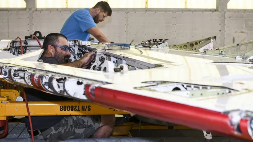 Кристофер Уильямс (слева) и Джеффри Зумвальде, слесари (жестянщики) по листовому металлу в Центре готовности флота Юго-Восток, выполняют модернизацию крыла самолёта T-45 Goshawk в рамках программы продления срока службы 27 марта 2025 года