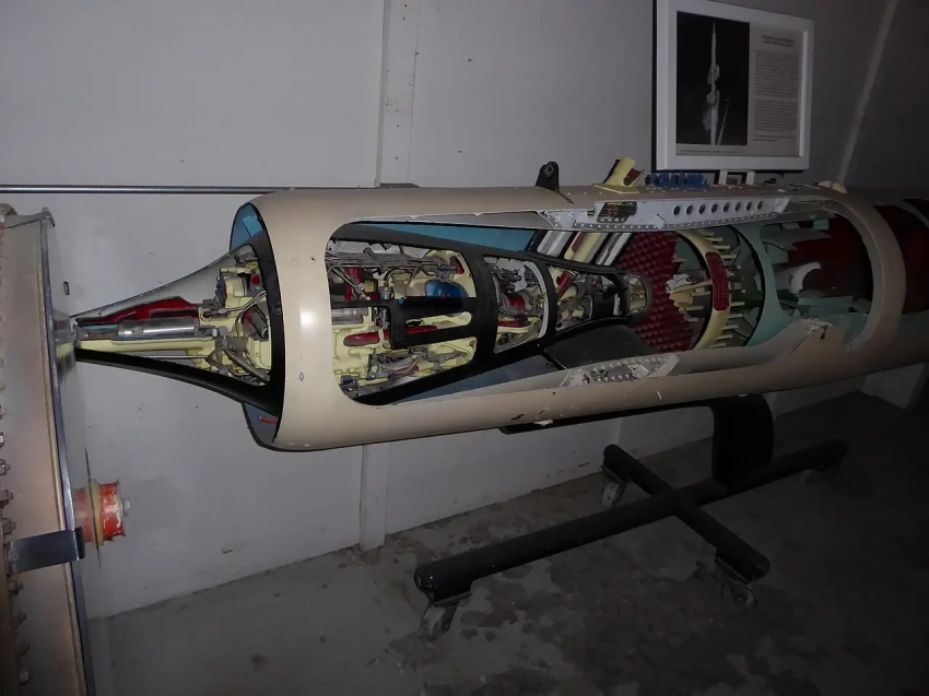 Прямоточный воздушно-реактивный двигатель Marquardt RJ43-MA-9 в разрезе, выставленный в Музее авиации и астронавтики Сан-Диего, пристройке к аэродрому Джиллеспи-Филд, Сан-Диего, Калифорния. Модифицированная версия этого двигателя использовалась в качестве двигателя для D-21